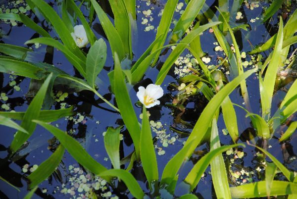 Krabbescheer (Stratiotes aloides): Deze plant drijft en heeft een mooie bloem. Het biedt schaduw en neemt voedingsstoffen op.